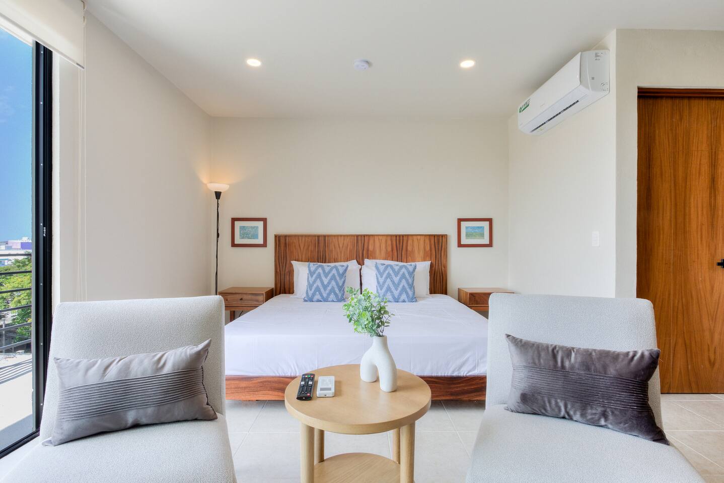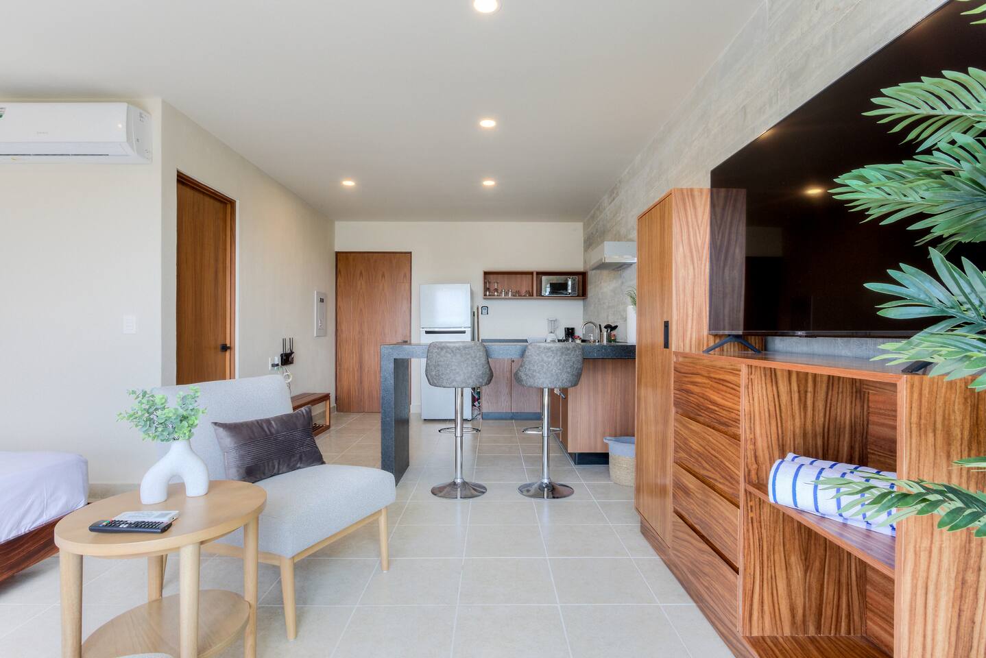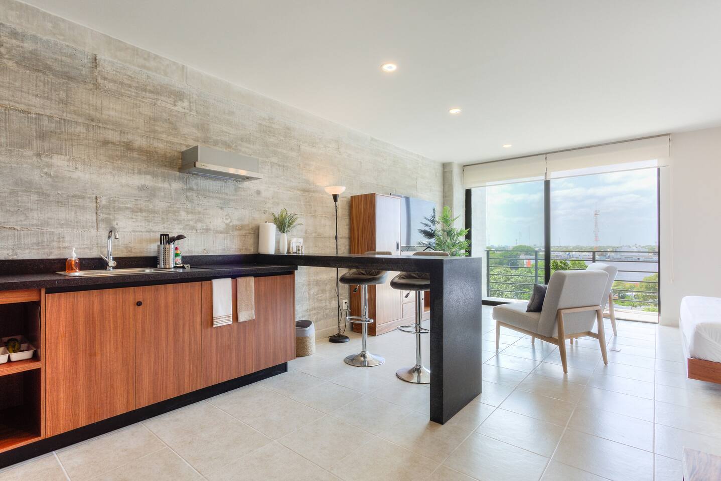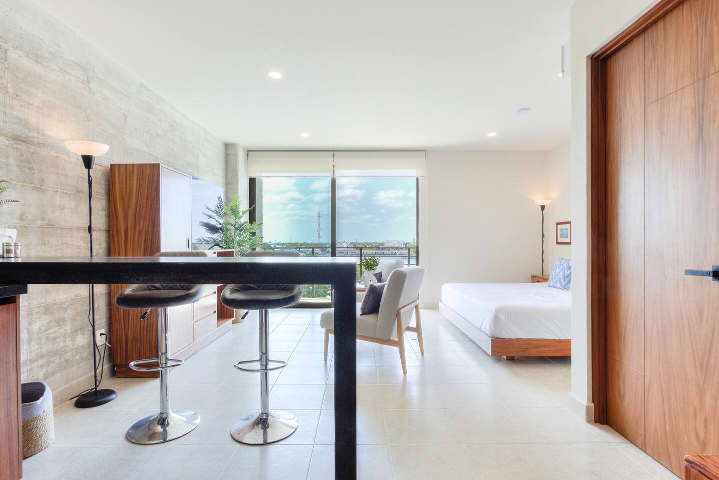 Centrally located on Av. Nader, Cancun's heart. Enjoy 24/7 security, pool, gym, high-speed wifi, and coworking space. Steps from restaurants, supermarkets, and bars, with direct transport to the Hotel Zone just meters away. Ideal for travelers seeking comfort, style, and a central location.