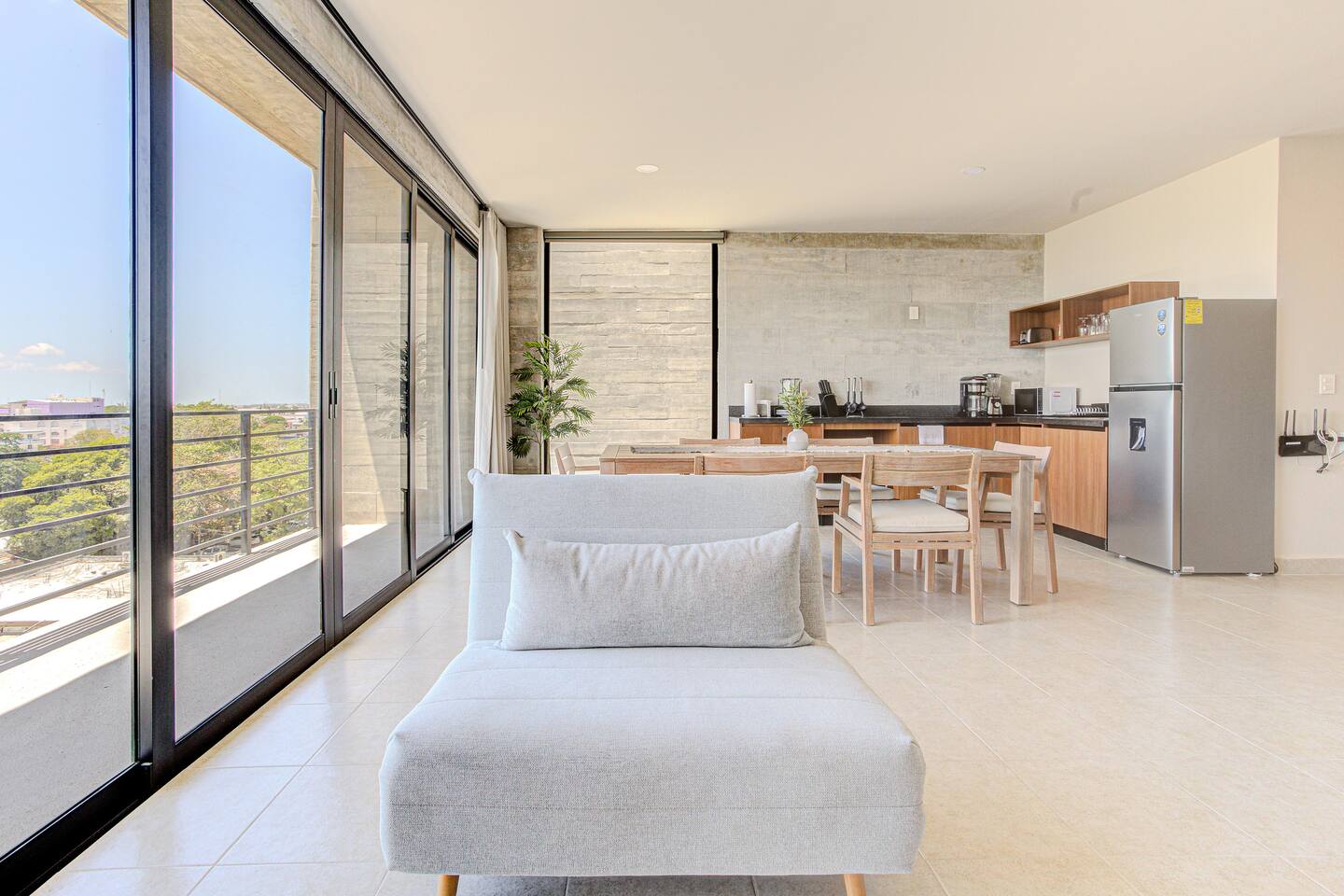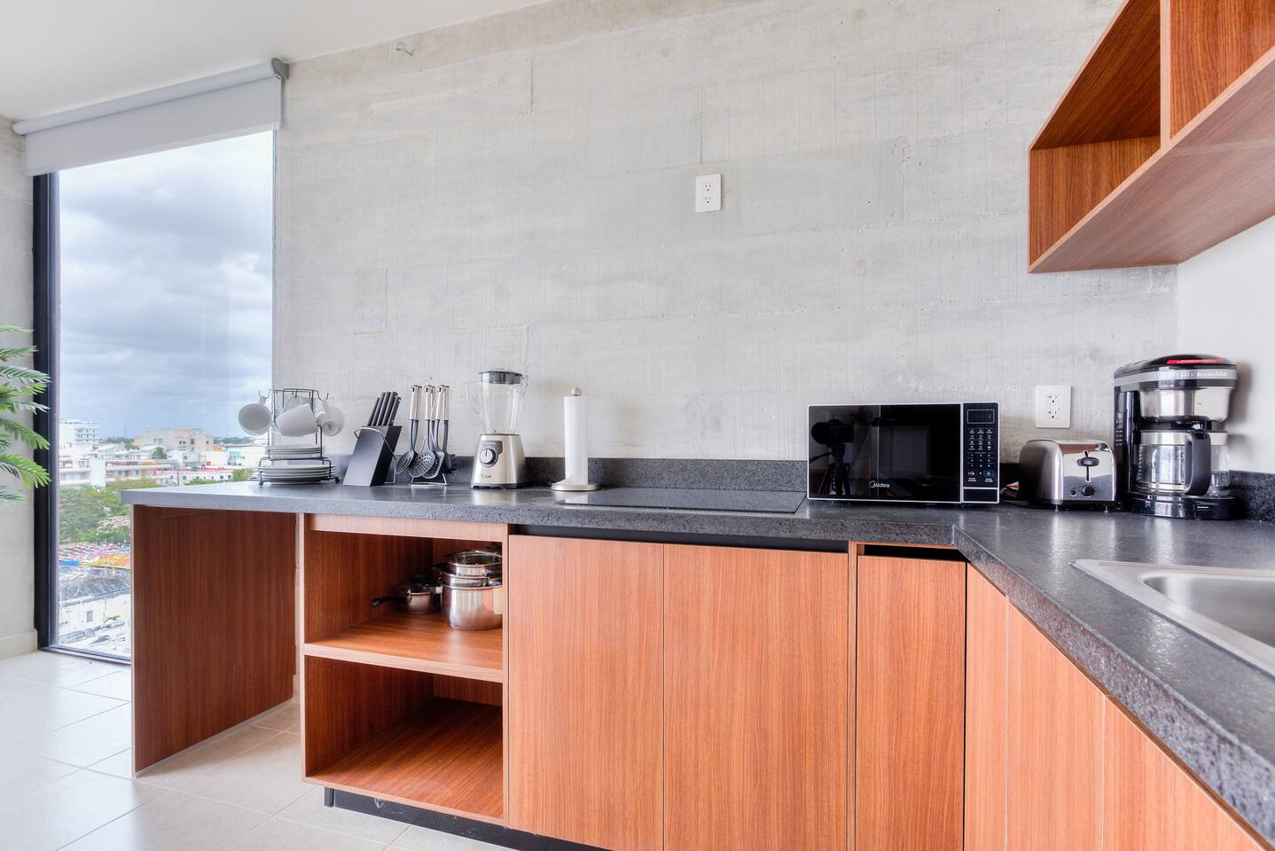Centrally located on Av. Nader, Cancun's heart. Enjoy 24/7 security, pool, gym, high-speed wifi, and coworking space. Steps from restaurants, supermarkets, and bars, with direct transport to the Hotel Zone just meters away. Ideal for travelers seeking comfort, style, and a central location. Important: The apartment does not have a television.